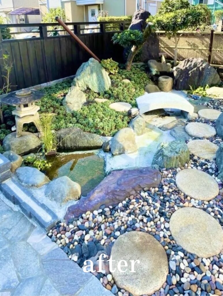 石畳や灯篭などを設置し、和風のお庭にリフォームいたしました。
