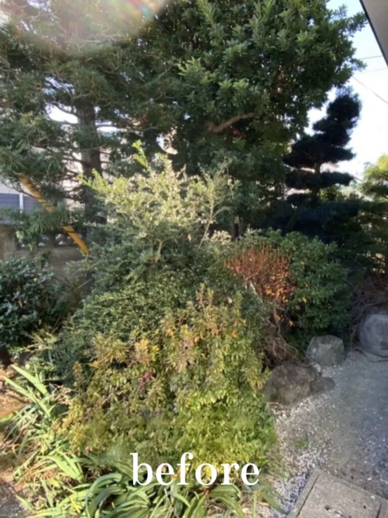 生い茂っていた樹木を伐採し、既存の石などを活かした和風のお庭にリフォーム♪