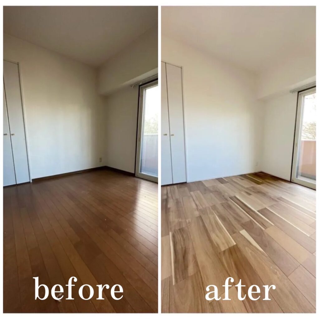 傷の目立ちにくいモザイク木目のフローリングにリフォーム。シンプルで明るい印象の洋室に大変身。