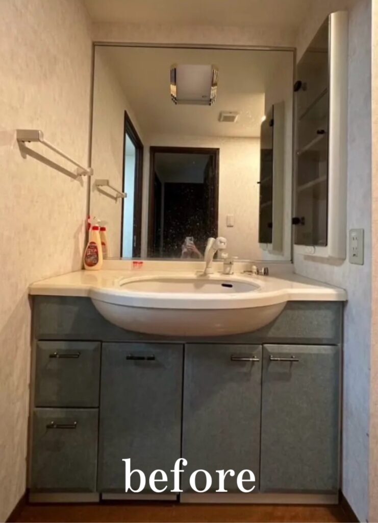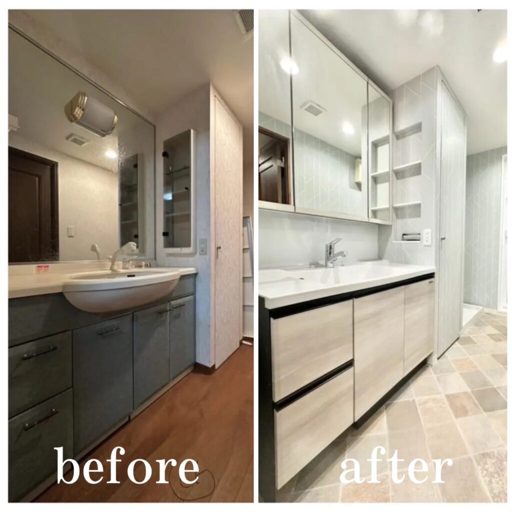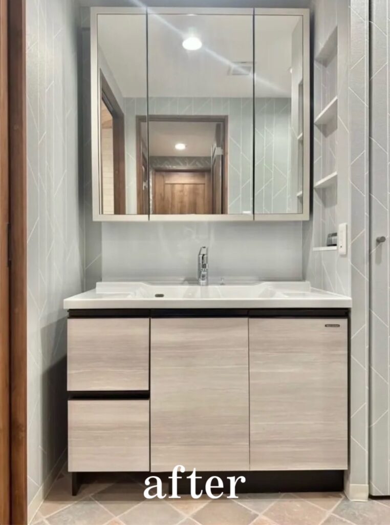鏡面積の使い勝手の悪い開き戸収納からオープン収納に。