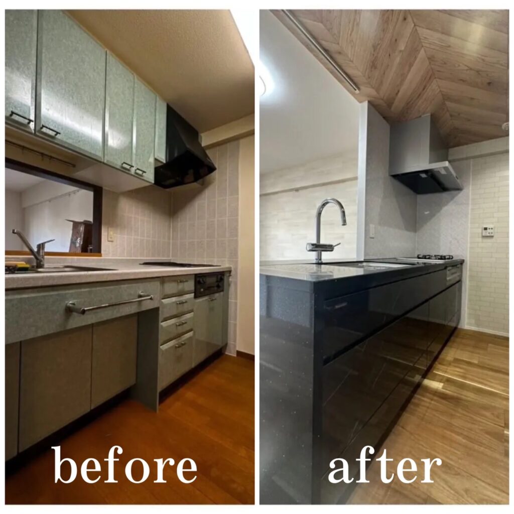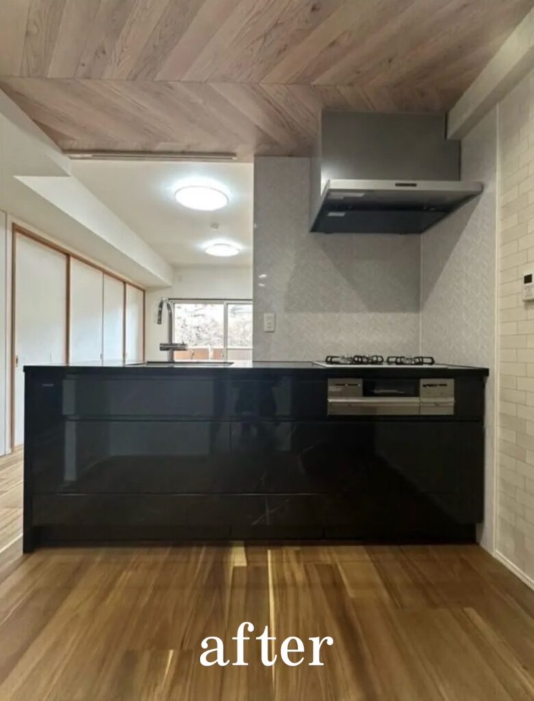 黒い大理石のキッチンにすることで高級感のあるキッチンにリフォーム。