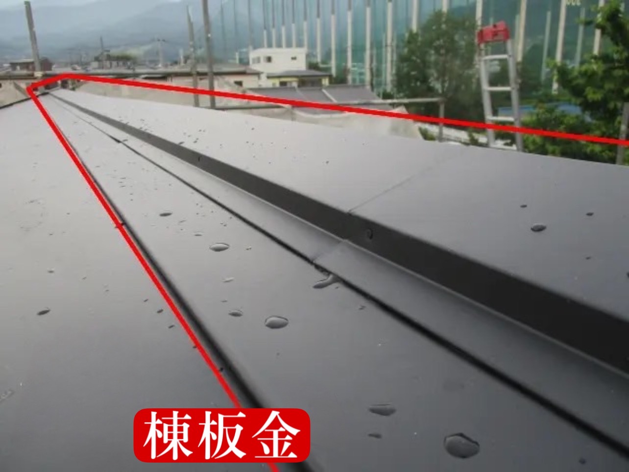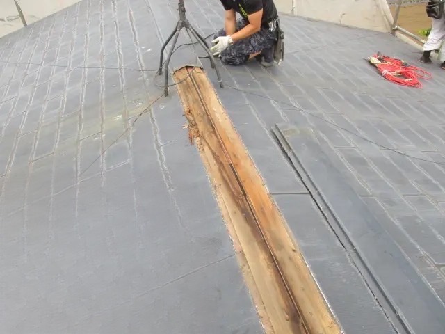 屋根のてっぺんに取り付けられている棟板金を取り外し、