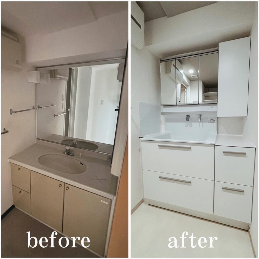 1面鏡付き洗面化粧台から3面鏡付き洗面化粧台にリフォーム。